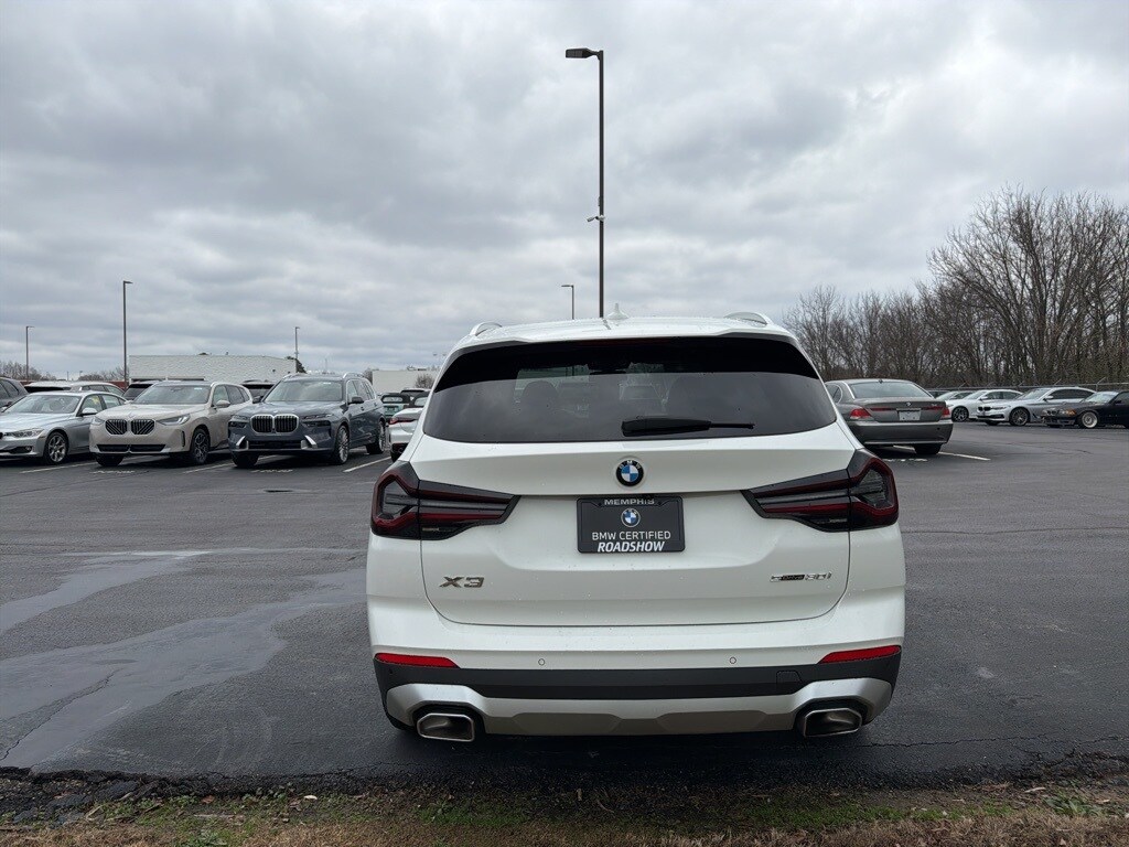 CARFAX One-Owner. Clean CARFAX. Certified. Alpine White 2024 BMW X3 sDrive30i RWD 8-Speed Automatic Sport I4 ** NAVIGATION SYSTEM **, ** ALUMINUM WHEELS **, ** AMBIENT LIGHT PACKAGE **, ** BACKUP CAMERA **, ** BLUETOOTH **, ** CONVENIENCE LIGHT PACKAGE **, ** CONVENIENCE PACKAGE **, ** MOONROOF **, ** POWER MIRROR PACKAGE **, ** REMOTE START **, ** SUNROOF/MOONROOF **, 8-Speed Automatic Sport, 12 Speakers, ABS brakes, Active Park Distance Control, Air Conditioning, Apple CarPlay & Android Auto Compatibility, Auto High-beam Headlights, Auto-dimming door mirrors, Auto-dimming Rear-View mirror, Automatic temperature control, BMW Assist eCall, BMW TeleServices, Brake assist, Bumpers: body-color, Comfort Access Keyless Entry, Connected Package Pro, Convenience Package, Delay-off headlights, Driver door bin, Driver vanity mirror, Dual front impact airbags, Dual front side impact airbags, Electronic Stability Control, Emergency communication system: BMW Assist eCall, Enhanced USB & Bluetooth w/Smartphone Integration, Exterior Parking Camera Rear, Four wheel independent suspension, Front anti-roll bar, Front Bucket Seats, Front Center Armrest, Front dual zone A/C, Front reading lights, Fully automatic headlights, Garage door transmitter, Genuine wood dashboard insert, Genuine wood door panel insert, Heated door mirrors, Heated Front Seats, Hi-Fi Sound System, Illuminated entry, Knee airbag, Leather steering wheel, Low tire pressure warning, Lumbar Support, Memory seat, Navigation, Navigation System, Occupant sensing airbag, Outside temperature display, Overhead airbag, Panic alarm, Panoramic Moonroof, Parking Assistance Package, Parking Assistant Plus, Passenger door bin, Passenger vanity mirror, Perforated SensaTec Upholstery, Power door mirrors, Power driver seat, Power Front Seats, Power Liftgate, Power passenger seat, Power steering, Power windows, Rain sensing wipers, Rear air conditioning, Rear anti-roll bar, Rear reading lights, Rear seat center armrest, Rear window defroster, Rear window wiper, Rear-View Camera, Remote Engine Start, Remote keyless entry, Security system, Speed control, Speed-sensing steering, Speed-Sensitive Wipers, Split folding rear seat, Spoiler, Sport Seats, Sport steering wheel, Steering wheel mounted audio controls, Surround View w/3D View, Tachometer, Telescoping steering wheel, Tilt steering wheel, Traction control, Trip computer, Turn signal indicator mirrors, Wheels: 19" x 7.5" Y-Spoke (Style 693), WiFi Hotspot.